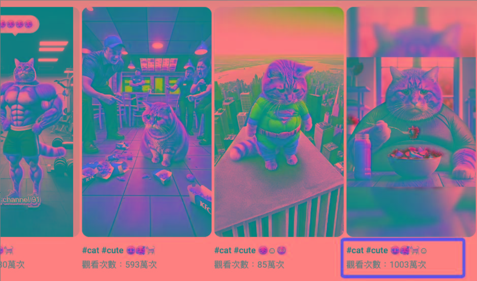 视频制作非常简单,只需要5-6张分镜图,根据剧情依次拼接在一起,再配上魔性洗脑的喵喵喵BGM,利用AI帮我们写故事,生成高质量的分镜图